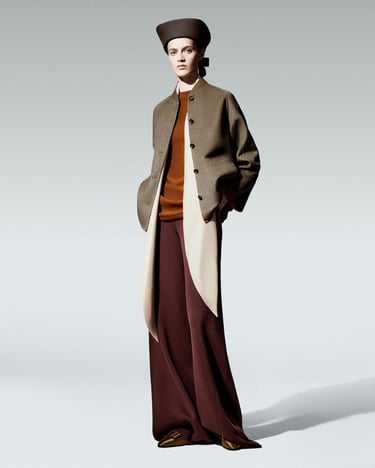 Pour cet automne, Loro Piana a misé sur des tons doux et enveloppants, inspirés de la nature. Des nuances de beige, de gris perle, de bleu ardoise et de terracotta se sont déployées sur le podium, créant un contraste délicat entre le raffinement des matières et la simplicité de la palette chromatique. Chaque pièce semblait racontée une histoire, chaque couleur une émotion.
